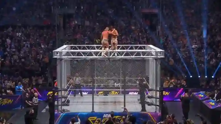A sacola também continha tachinhas, que acabaram cravadas na parte inferior do corpo de Fletcher quando Ospreay aplicou um “Styles Clash” sobre elas. Os três homens terminaram sangrando, com Davis sendo atingido pela porta da jaula na cabeça.